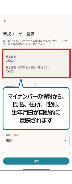 マイナンバーの情報から、氏名、住所、性別、生年月日が自動的に反映されます。