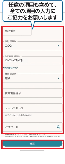 任意の項目も含めて、全ての項目の入力し、[確認]を選択します。