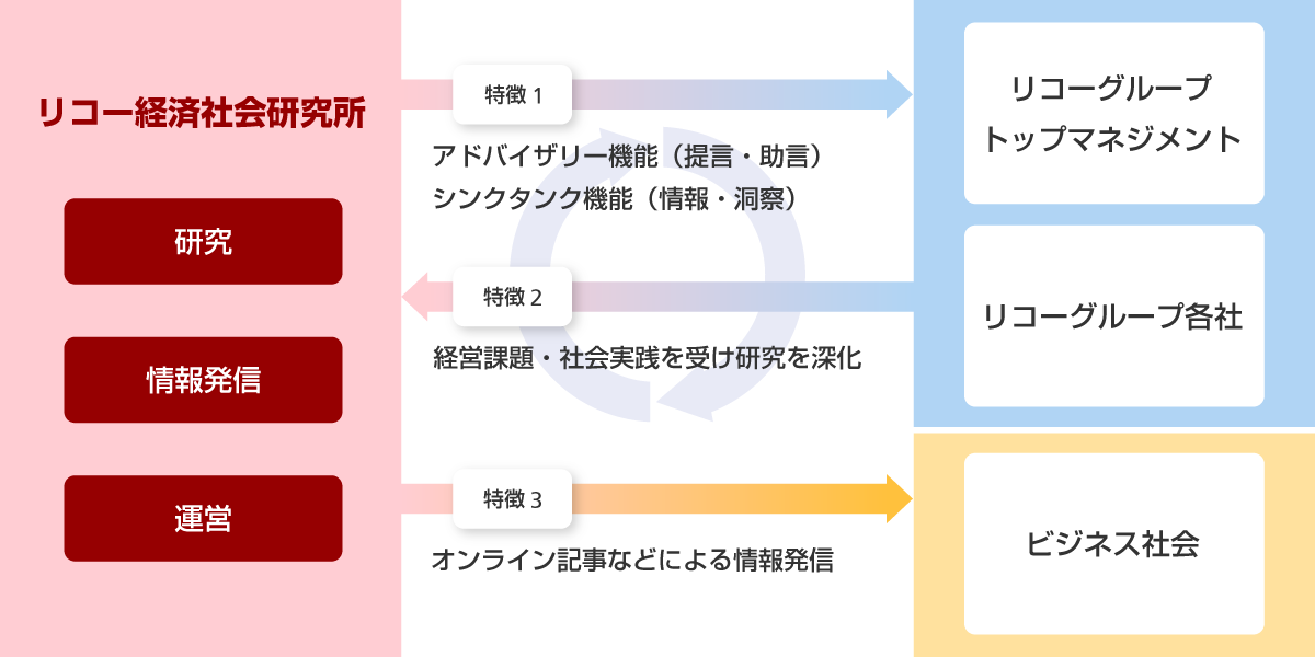 リコー経済社会研究所(Ricoh Institute of Sustainability and Business)は2010年4月に設立されました。激動するグローバル経済や社会構造の未来を予測しながら企業経営へのインパクトを研究する「シンクタンク機能」のほか、その成果を基にリコー経営陣に対して提言を行う「アドバイザリー機能」があります。また、「オンライン記事」の発行などを通じ、ビジネス社会への情報発信も積極的に行っています。