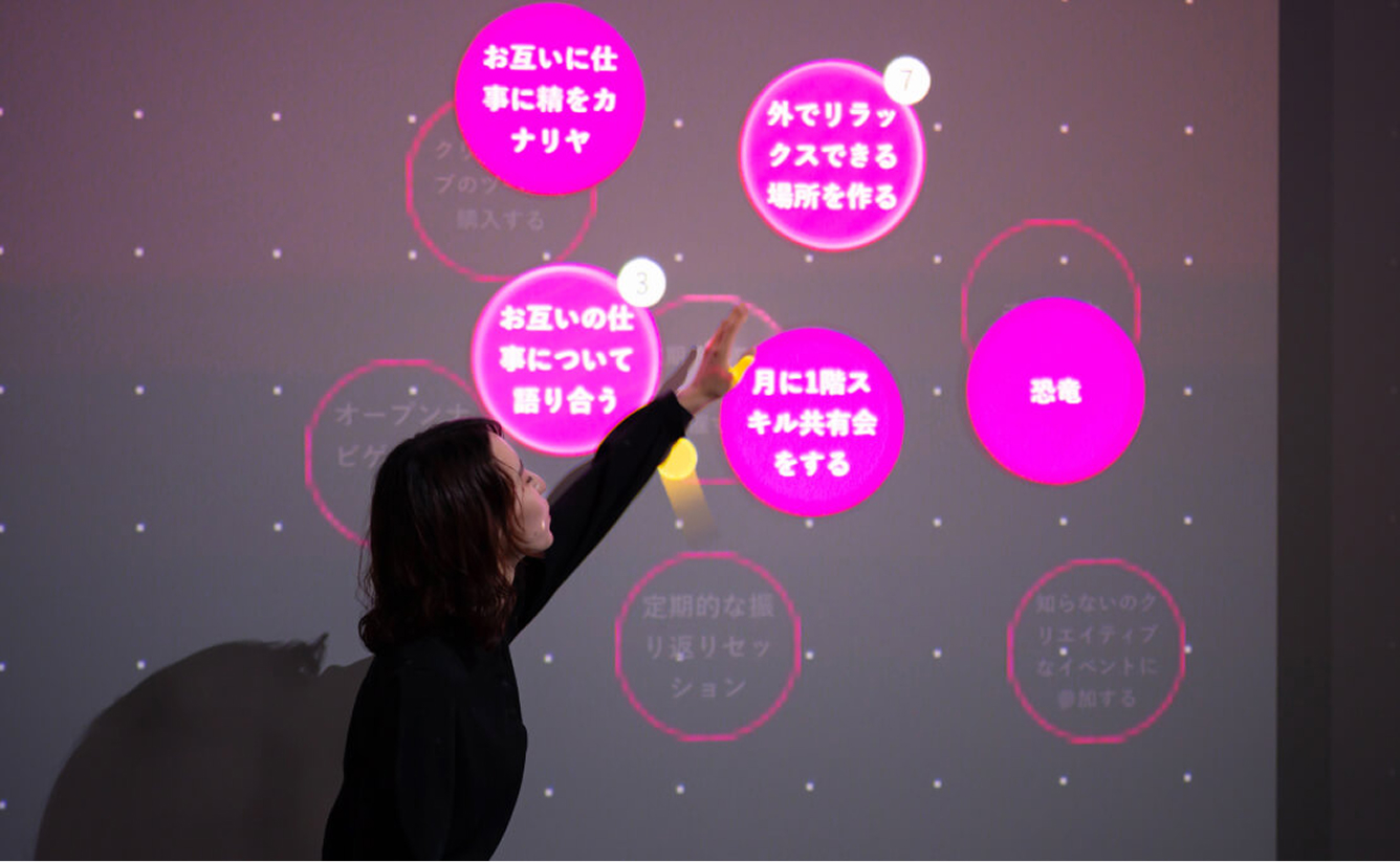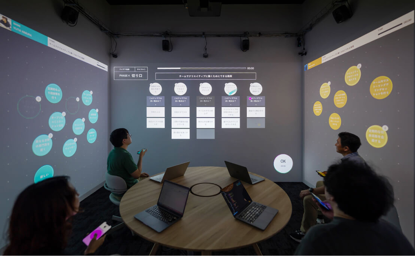 映像、光、音がチームを誘導します。参加者全員が役職や役割にとらわれず、フラットにアイデアを出したり、考えることに集中できます。