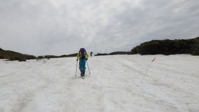 雪面が狭まって来て途切れそうになるが少しだけ繋がっていて、それを越えるとまた広い斜面へ出た。
