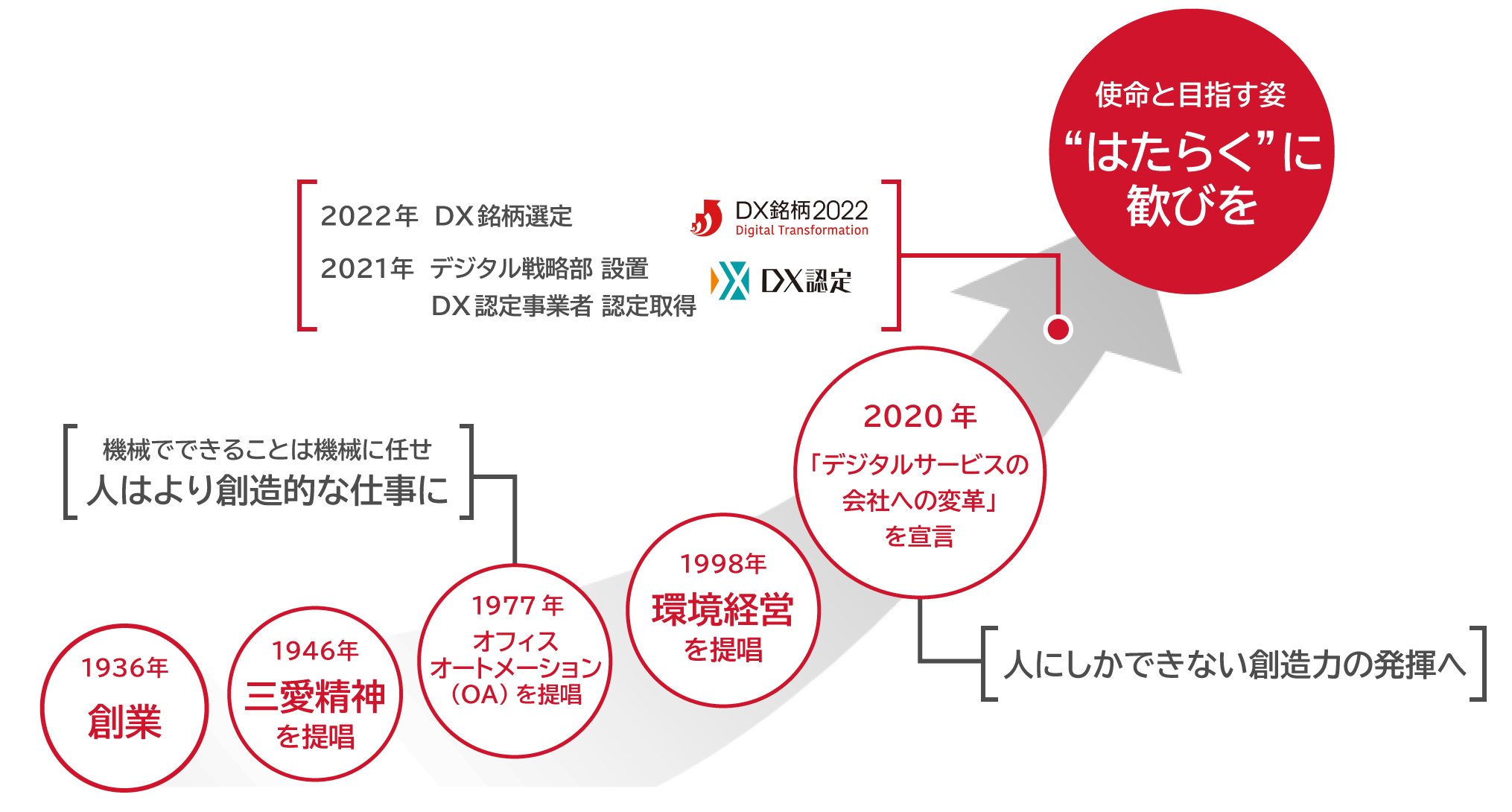 リコーは創業以来、お客様の “はたらく” に変わらずに寄り添い続け、変わりゆくお客様の “はたらく” に応じた価値を提供し続けてきました。 1977年に、「機械でできることは機械に任せ、人はより創造的な仕事に」という、オフィスオートメーション(OA)を提唱しました。 1998年には「環境経営」を提唱し、「環境保全と利益創出の同時実現こそ、サステナブルな活動になる」という信念に基づき、事業を通じた社会課題解決を追求しています。