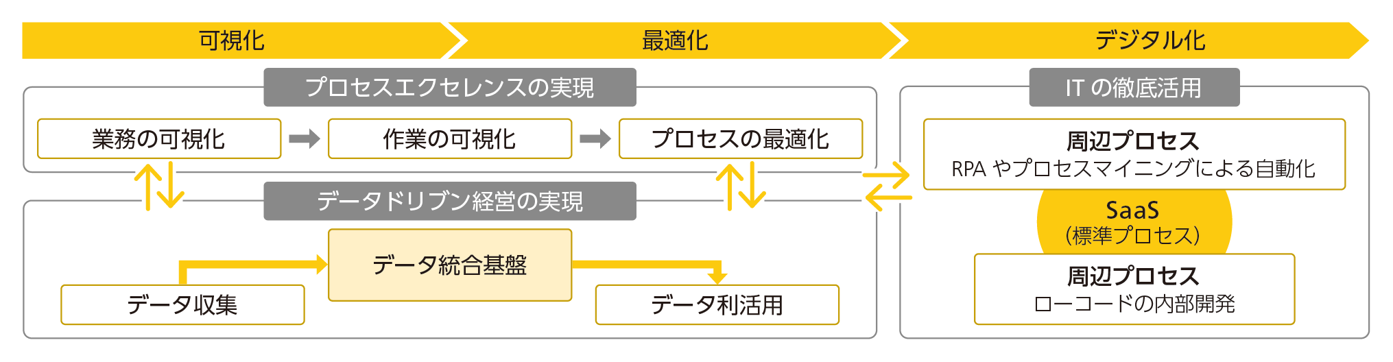 プロセス・IT・データの三位一体によるオペレーショナルエクセレンスの実現に向け、社内業務プロセス全体を対象に、デジタル技術とデータの利活用により業務を改革する「型」を定義し、その型に基づいて業務改革を実践する「プロセスDX」を推進しています。あわせて、こうした実践に必要なスキルを習得する人材育成にも取り組んでいます。