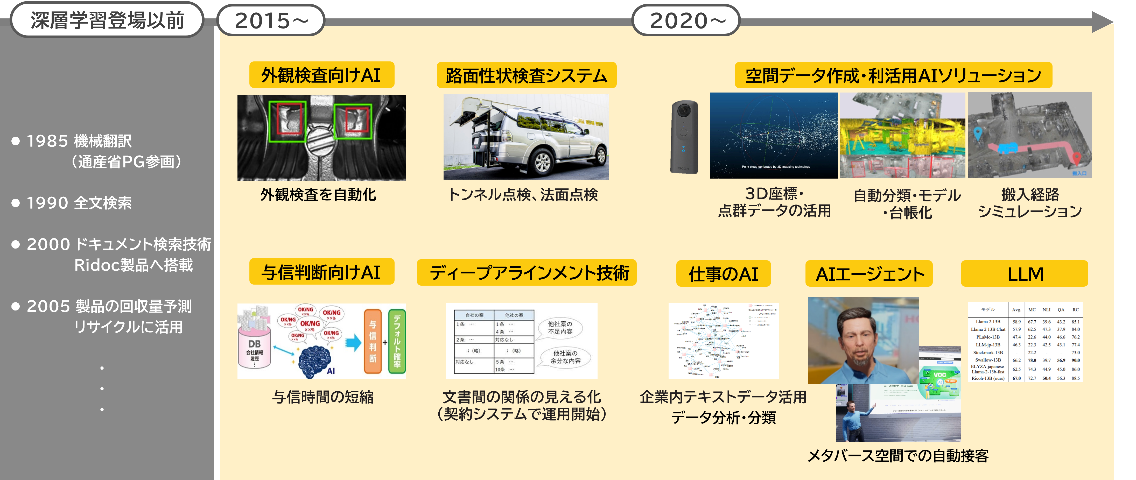 リコーは1980年代から、「画像・空間認識系」 「自然言語系」の領域でAIを開発・実践活用しています。車載カメラで撮影した路面をAIが解析し、破損個所を見つける「路面性状検査システム」や、企業に日々蓄積されるデータを、リコー独自の自然言語処理AI技術で、体系化して活用できるデータにする「仕事のAI」などがあります。直近では、日本語精度の高いLLMや、日英中3言語に対応したLLMの開発を発表しました。