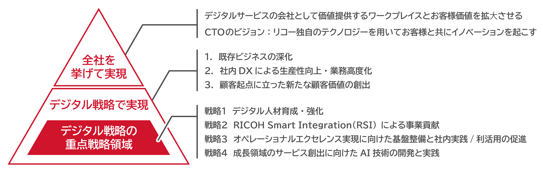 デジタル戦略で目指すのは、①既存ビジネスの深化、②社内プロセスDXによる生産性向上や業務高度化、③顧客起点の新たな価値創出の3つです。これらを実現するために戦略1:デジタル人材育成・強化、戦略2:RICOH Smart Integration(RSI)によるビジネス支援、戦略3:プロセス・IT・データによるオペレーショナルエクセレンス実現に向けた基盤整備と社内実践、戦略4:成長領域のサービス創出に向けたデジタル技術開発の4つの主要戦略を推進し、ワークプレイスサービスプロバイダーとしてのお客様への価値提供を全社で一層拡大していきます。