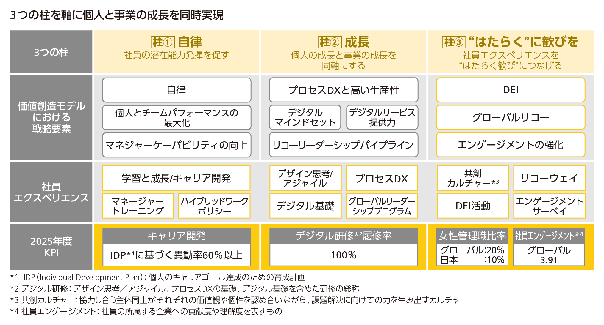 21次中経において、人的資本施策として、「自律:社員の潜在能力発揮を促す」「成長:個人の成長と事業の成長を同軸にする」「“はたらく”に歓びを:社員エクスペリエンスを“はたらく歓び”につなげる」の3つを柱に掲げています。社員の自律と成長を促し、はたらくことに歓びを感じることが、デジタルサービスの会社への変革を加速させ、同時に事業の成長にもつながります。