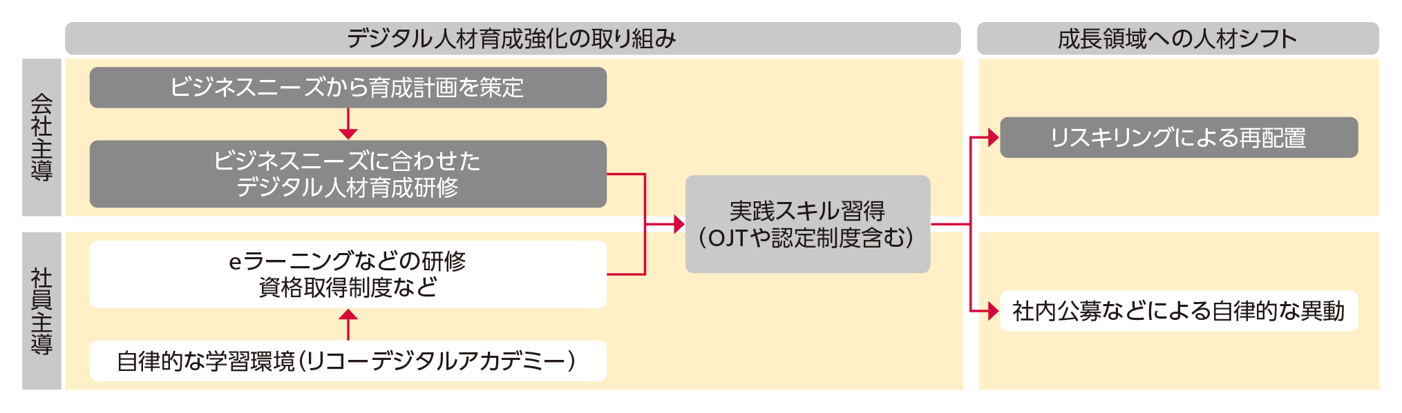 活躍の場を見据えたデジタル人材育成、重点育成人材の拡充、リコーデジタルアカデミーを核とした育成プログラムの継続・強化についてご紹介します。