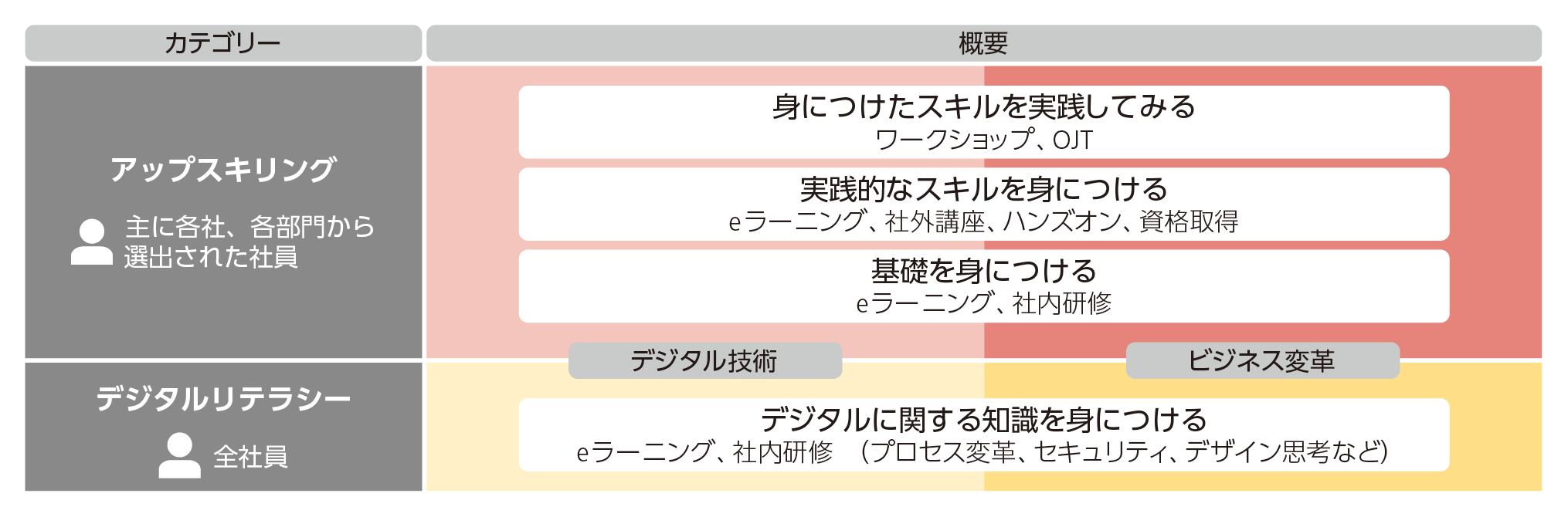 顧客接点で価値を創造し、事業成長を加速する「デジタル人材」(「デジタル技術とデータを使いこなし、デジタルサービスを創出・加速させる人材」と独自に定義)の育成・強化を経営戦略の柱に掲げるとともに、21次中経における全社のESG目標の1つとしてもコミットしています。