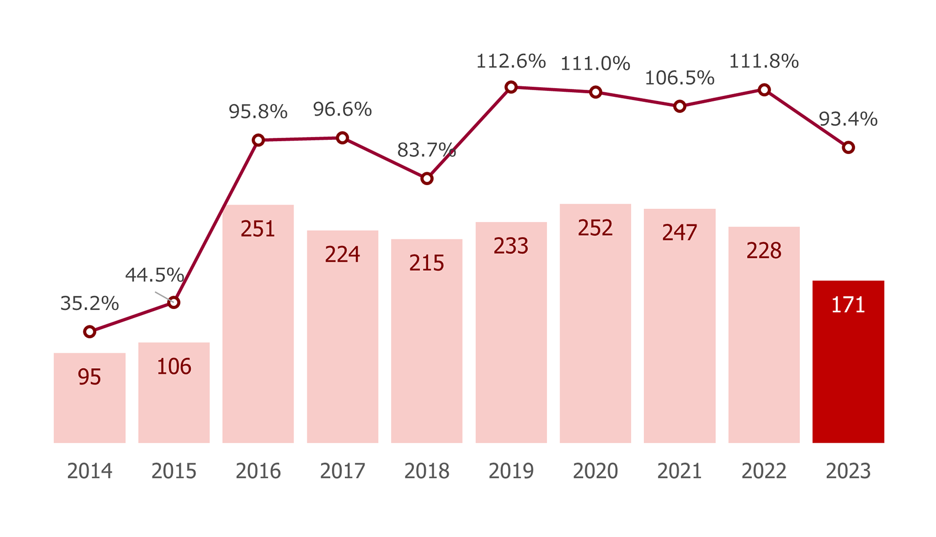 子が生まれた年度と育児休業を取得した年度が異なるケースがあり、取得率として100%を超えることがあります。