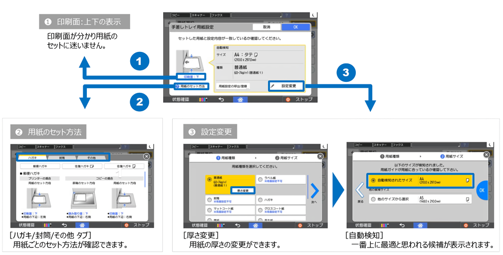 作業支援の一つとして、手差しトレイに用紙をセットすると自動検知した結果の表示をする様にしました。