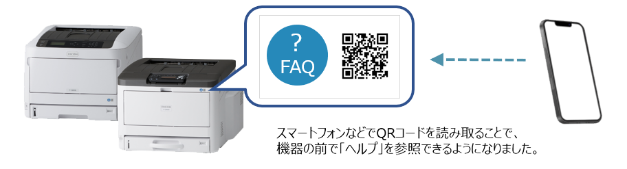 機種ごとのヘルプ画面にアクセスするためのQRコードを本体に添付し、操作時にすぐにヘルプをご参照いただけるようになりました。