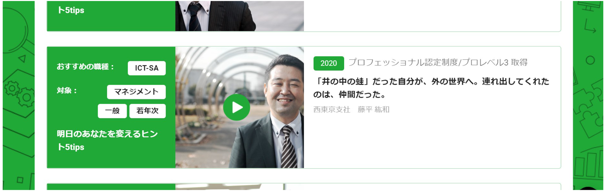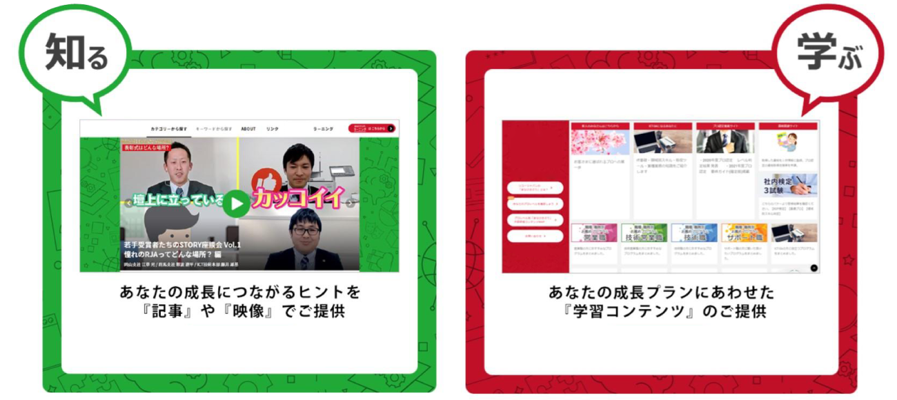 RJ AWARD 受賞者の中でも高評価を受けた社員について、受賞までのストーリーのナレッジを映像化した「STORY映像」。 プロフェッショナル認定制度で高いレベルを取得した社員について、日々心がけている5つのことをナレッジ映像化した「5TIPS映像」。