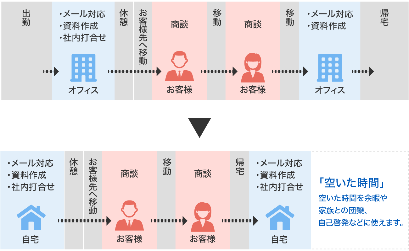オフィスに出社せず、訪問先に直接訪問することで移動時間を減らし、社員の負担軽減と生産性向上をめざします。