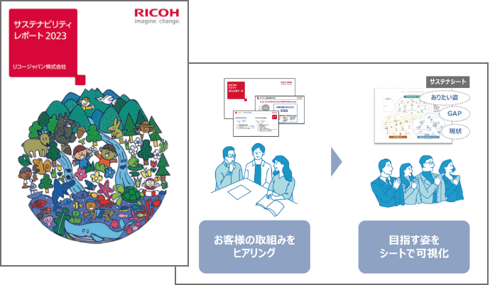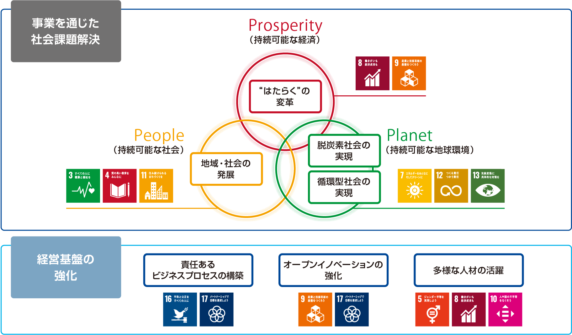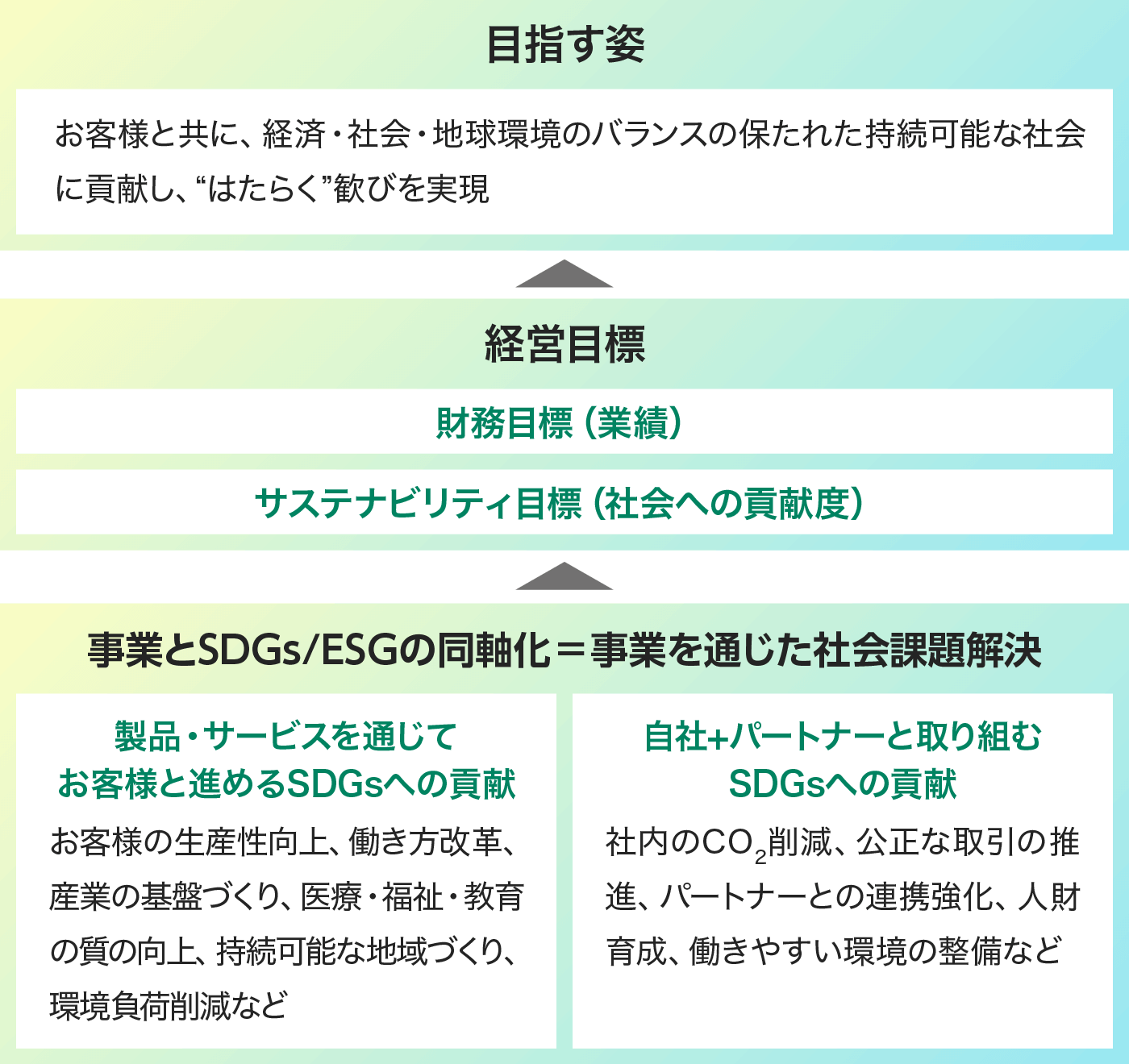 これらの取り組みを通じて、お客様と共に、経済、社会、地球環境のバランスの保たれた持続可能な社会に貢献し、「“はたらく”に歓びを」の実現を目指します。