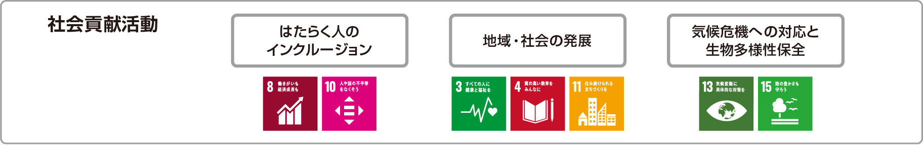 また、社会貢献活動においても、経営戦略やSDGsに沿った活動を展開しており、マテリアリティとグローバルな要請に基づき、「はたらく人のインクルージョン」「地域・社会の発展」「気候危機への対応と生物多様性保全」の3つの重点分野を設定しています。