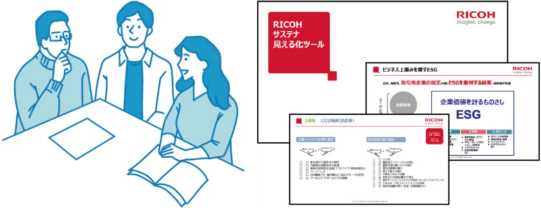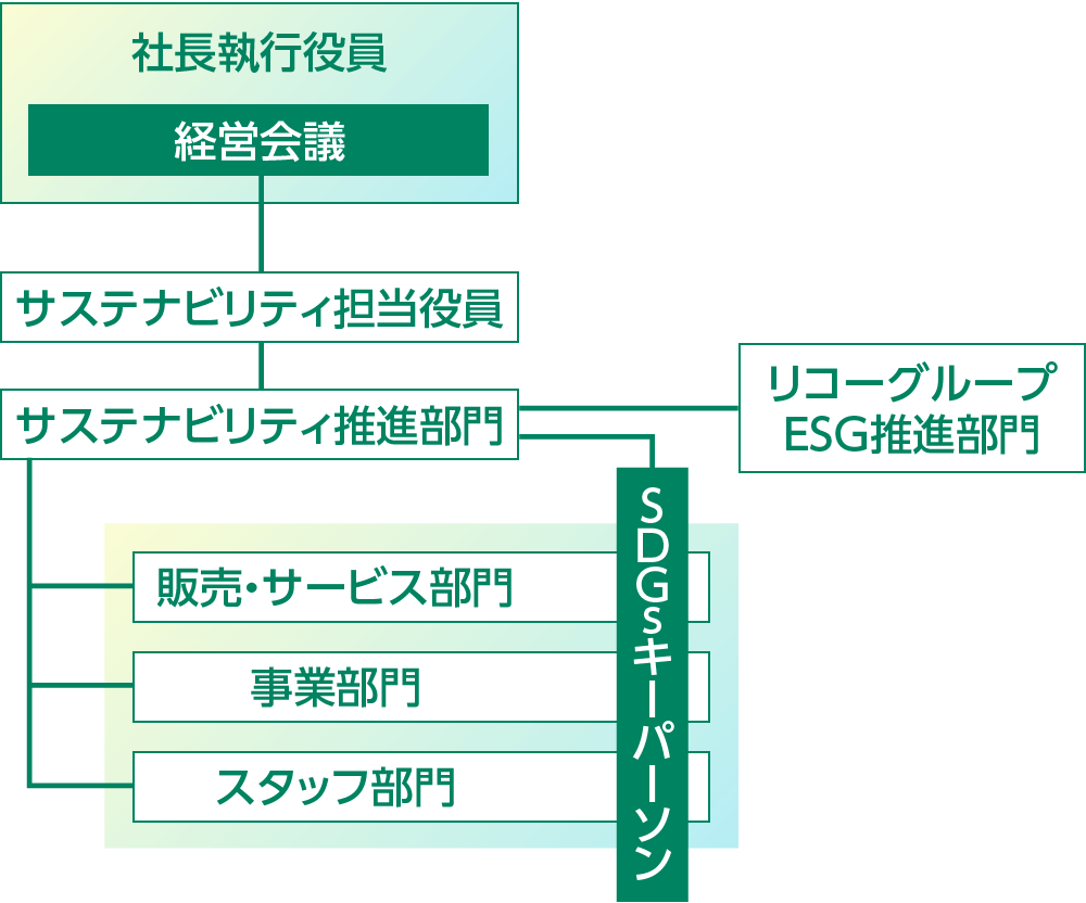 サステナビリティに関する方針や目標策定など、重要な案件については、リコーグループの方針を踏まえ、サステナビリティ推進部門の提案をもとに、経営会議で審議および決定しています。また、推進のための施策は、サステナビリティ推進部門が企画および立案し、担当役員の決定のもと、各部門責任者が実行および展開しています。