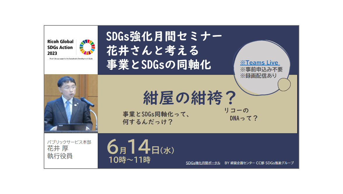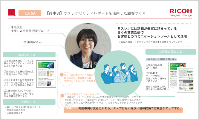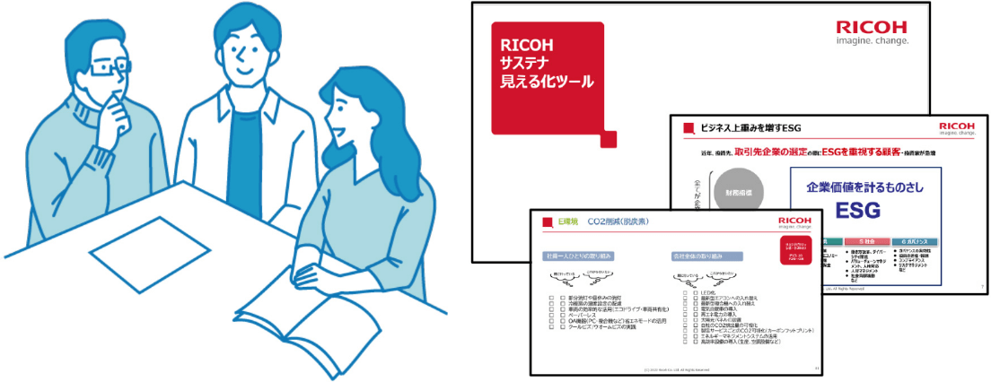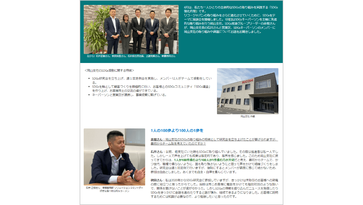 社内外へのSDGsの展開を加速するため、2018年からスタートしたSDGsキーパーソン制度。年度の始めに登録を募り、毎月実施している研修において、最新の社会動向やリコーグループの取り組み、支社の好事例を共有し、レベルアップを図っています。