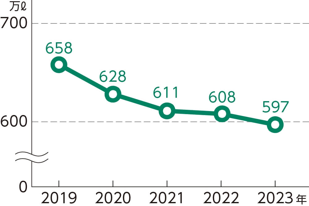 2024年度のガソリン使用量は、計画的な低燃費車への入れ替えやエコドライブの実施などを進めた事で、前年度比約4.8%の減少となりました。