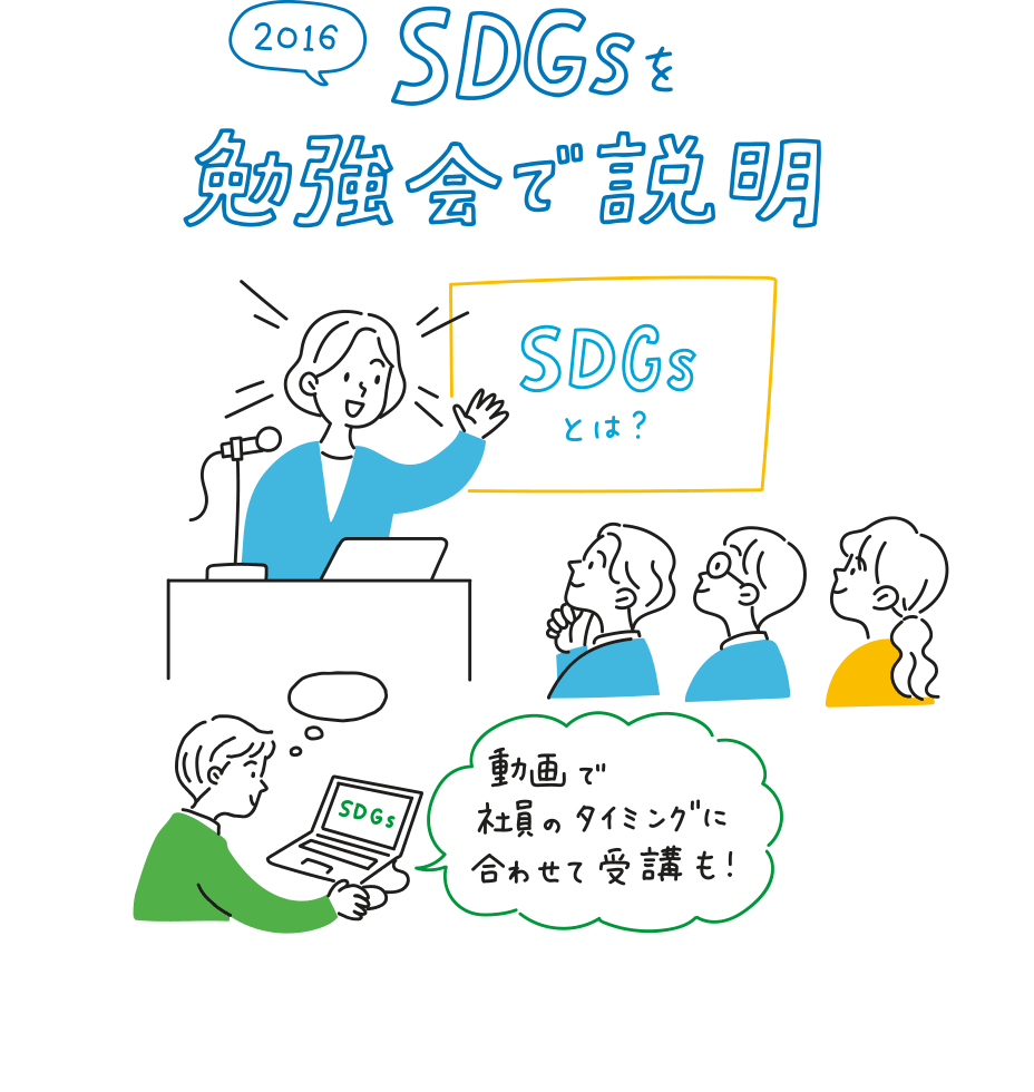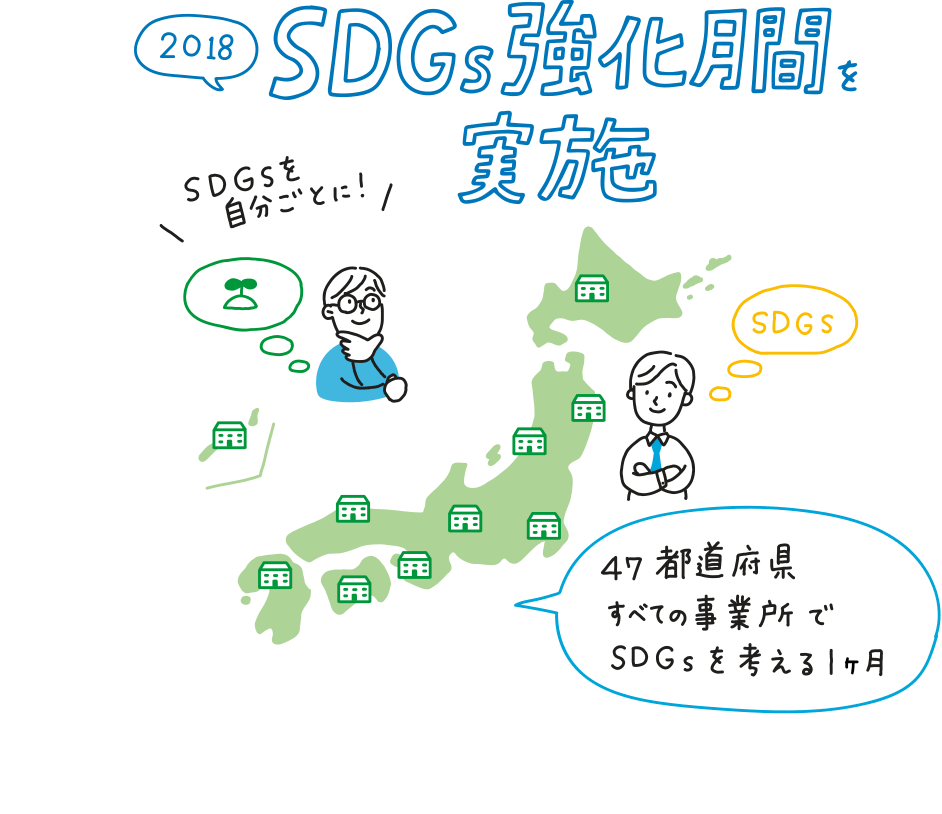 2018年より、SDGs強化月間の実施がスタートました。毎年2回、47都道府県すべての事業所で実施されるSDGs強化月間は、「自分たちの仕事がSDGsの達成にどうつながり、事業を通じた社会課題解決ができるのか」を真剣に考える貴重な機会となっています。