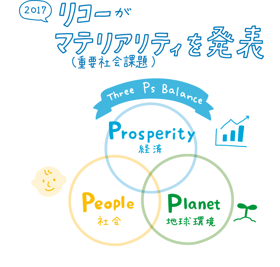 2017年、リコーがSDGsに紐づけたマテリアリティ(重要社会課題)を発表しました。目指すべき持続可能な社会の姿を、経済(Prosperity)、社会(People)、地球環境(Planet)の3つのPのバランスが保たれている社会「Three Ps Balance」として表しています。