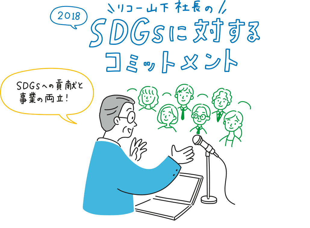 2018年2月、リコー山下社長(当時)より、SDGsに対するコミットメントがありました。SDGsへの貢献と事業の両立という戦略発表は、社内に大きなインパクトを与え、本格的に社内浸透が進むきっかけとなりました。
