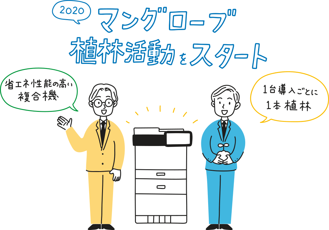2020年2月より、マングローブの植林活動をスタートしました。省エネ性能の高い複合機をお客様に導入いただくごとに、東南アジアにマングローブを植林しています。脱炭素社会の実現を加速させるため、お客様と一緒にSDGsに貢献していきたいという想いで始めた植林は、2024年3月で累計約42万本にのぼります。