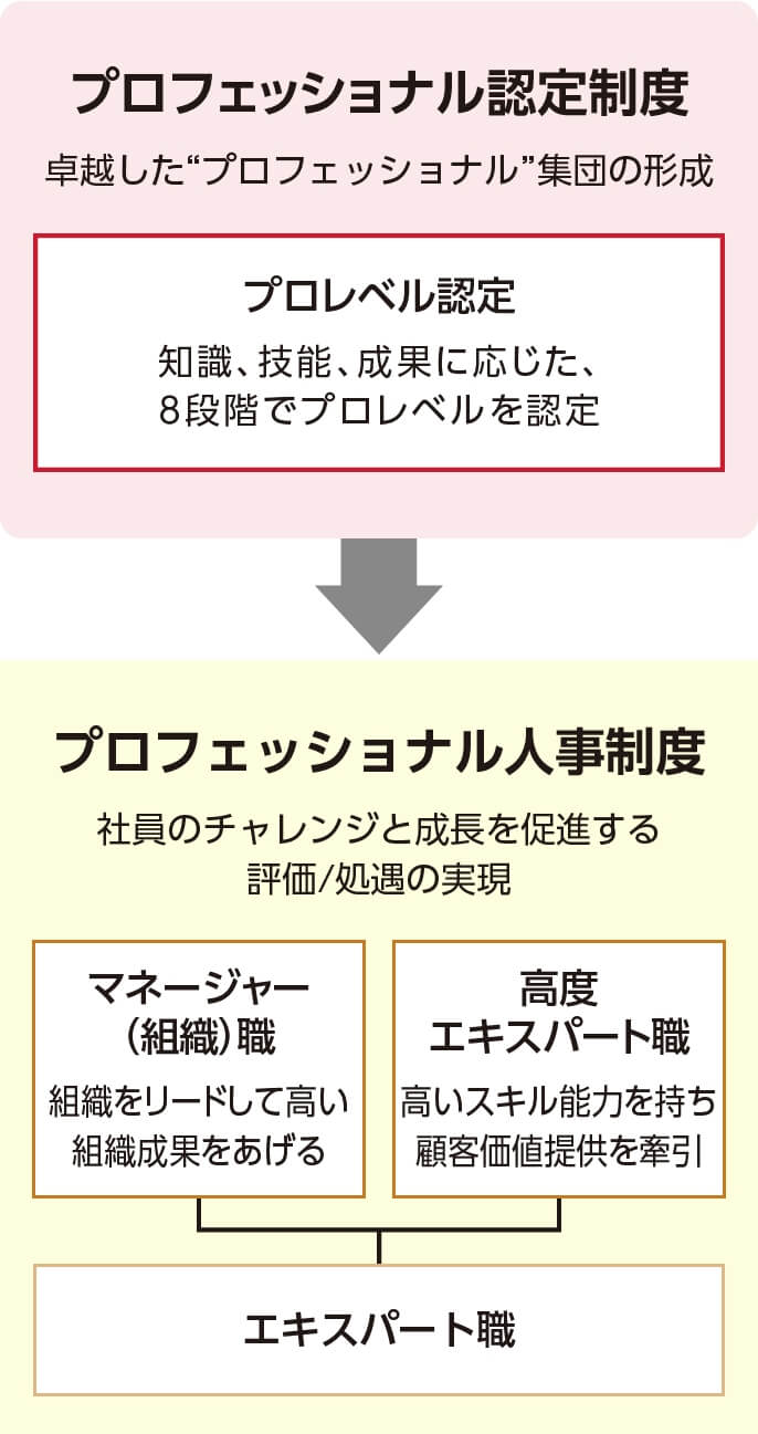 2020年度から進めている「プロフェッショナル認定制度」と、2023年4月にスタートした「プロフェッショナル人事制度」を連携させ、社員の自律的成長を後押しする体制を整備してきました。その結果、2024年度には20代で「高度エキスパート職」となる社員も現れています。これからも年齢や性別、経歴などにとらわれず、多様な価値観を持った人財が活躍できる環境を整え、スキル習得や成果創出を見える化し、それらを評価や処遇に反映することで、人事制度のさらなる精度向上を図っていきます。