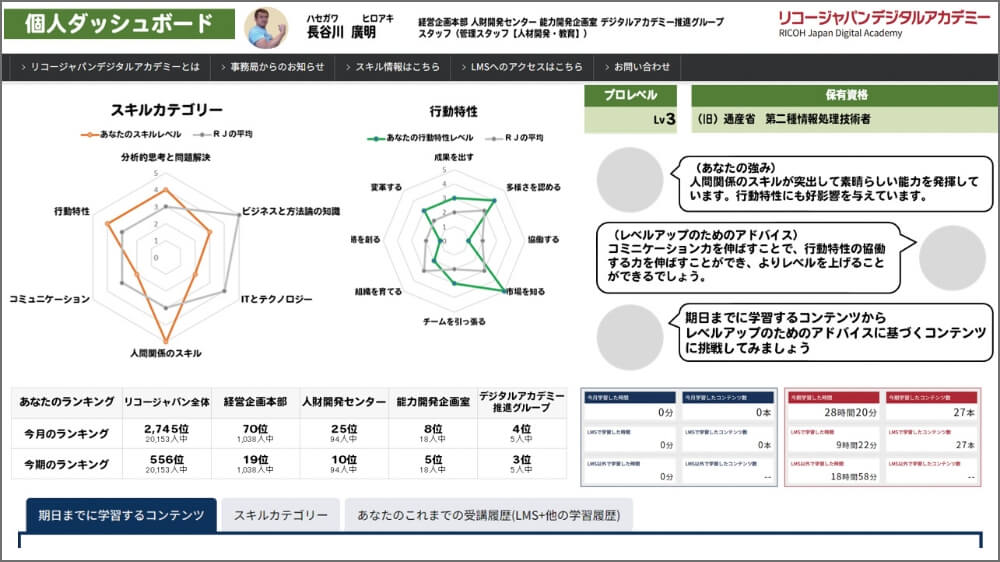 リコージャパンは2020年度から知識、技能、成果に応じた8段階でプロレベルを認定する「プロフェッショナル認定制度」を導入しています。