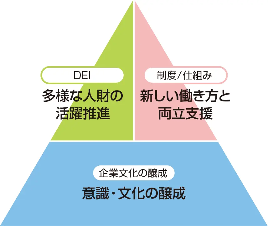 企業が継続的に成長するために、社員一人ひとりがワーク(仕事)とライフ(生活)をマネジメントしながらやりがいを感じて働き、社員エンゲージメントを高めていくことが重要と考え、DEIを推進しています。多様な人財の活躍推進に取り組み、また、多様な働き方と育児や介護との両立支援があたりまえの企業文化を醸成しています。