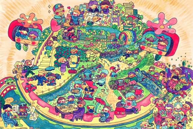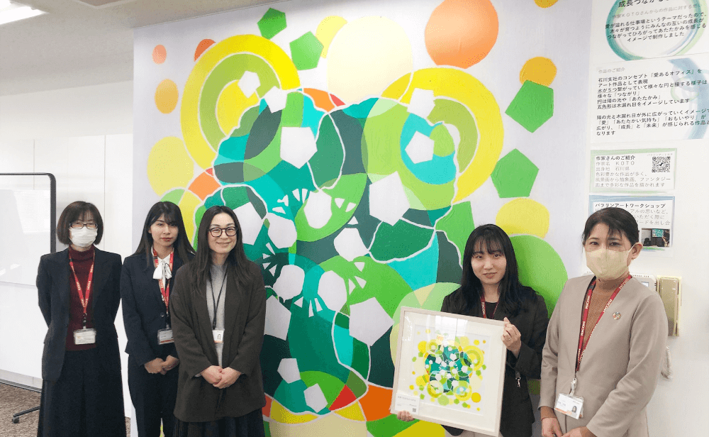 2024年1月、リコージャパン石川支社事業所のリニューアルに伴い、壁面を装飾する絵を障がい者アーティストのKOTOさんに描いていただきました。依頼するにあたり、リニューアルメンバーでディスカッションを行ない、描いていただきたい絵のキーワードを「成長」「未来」「つながり」「あたたかみ」に決定。約2ヵ月の制作期間を経て完成しました。来社されたお客様にも社会貢献の取り組みとしてご紹介しています。