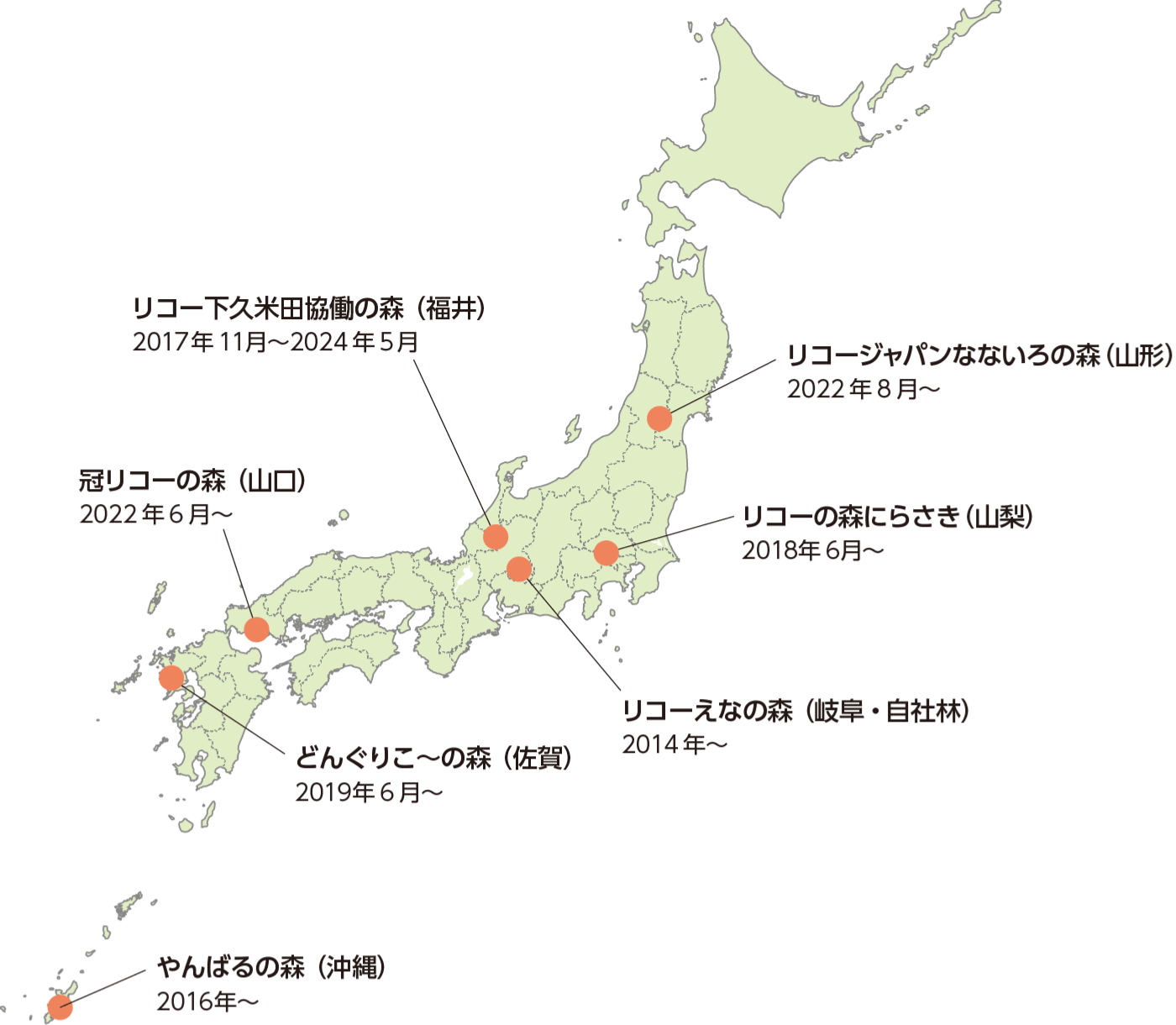 リコーグループは、生物多様性保全のみならず地球温暖化防止、持続可能なコミュニティ発展の観点からも森林保全が重要と考え、1999年より積極的な取り組みを行なっています。2014年からは、地域コミュニティの発展に貢献することを目的に、自治体、企業、地域住民など地域を主体としたさまざまなステークホルダーの皆様と連携して「ステークホルダー協働による森づくり」を全国で推進しています。また、リコーグループが所有する「えなの森」「ETRIA御殿場事業所」が環境省「自然共生サイト注1」に認定されています。この活動は、生物多様な里山の回復と人々が暮らすコミュニティの活性化を目指しています。
