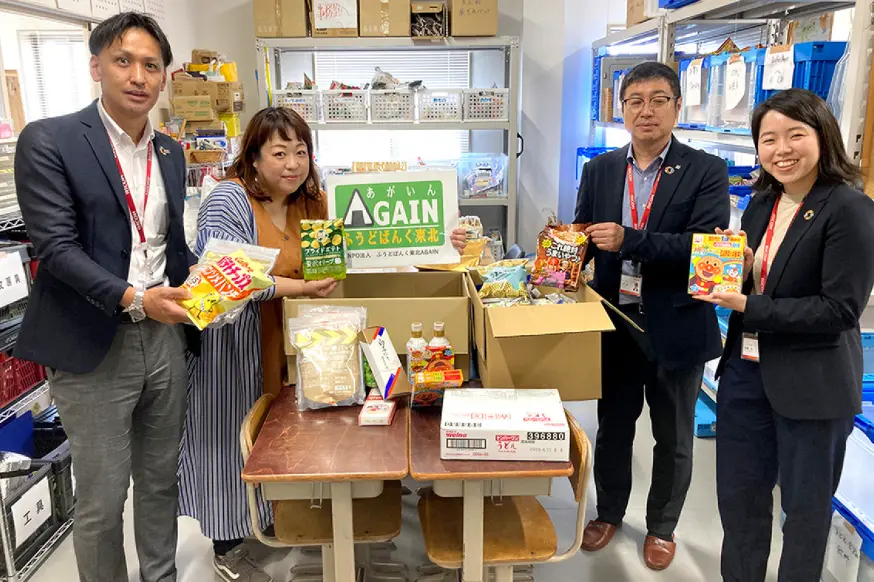宮城支社は、2020年から継続して「フードバンクWeek」を設け、NPO法人ふうどばんく東北AGAIN様へ寄贈を行ない、これまでに34回実施しました。社員の意識向上のため、お届けは各部署で行ない、現場の声を聞けるようにしています。お客様へも活動の輪が広がり、貧困世帯やこども食堂への「食料支援」に貢献しています。
