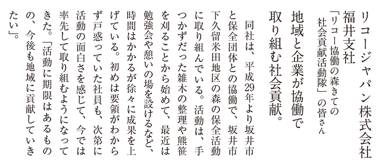 「自治体(坂井市)や地域住民との連携による里山保全活動を展開し、企業イメージの向上に貢献」