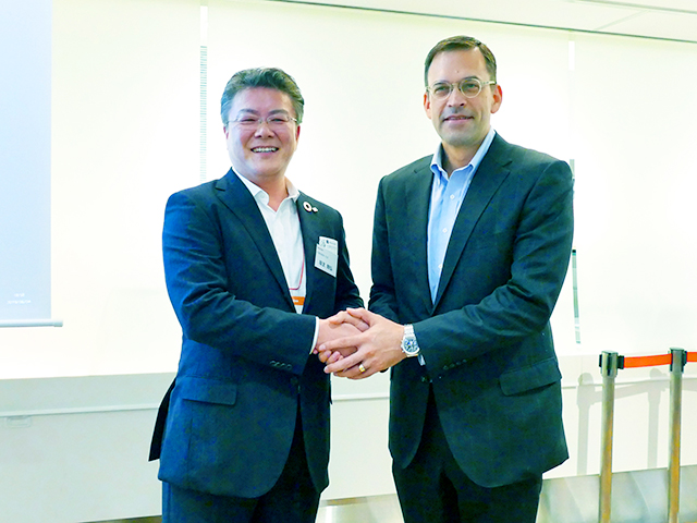 握手する日本マイクロソフト 平野社長(右)とリコージャパン 坂主社長(左)