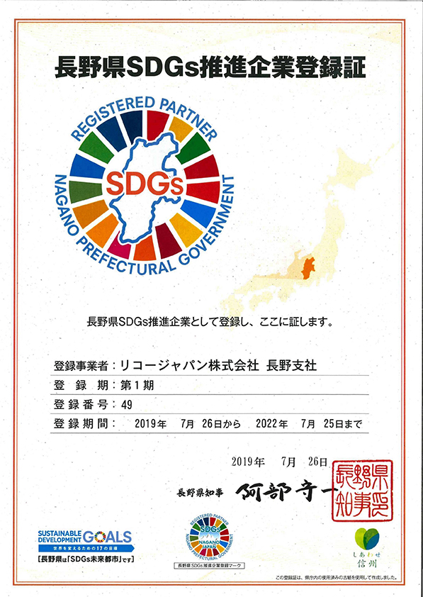 リコージャパン株式会社長野支社は、このたび長野県の「長野県SDGs推進企業」として登録されたことをお知らせいたします。