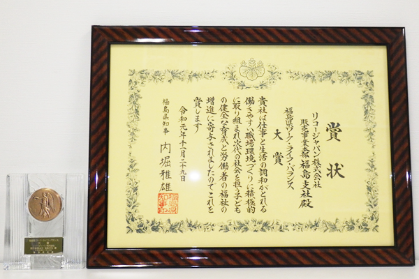福島支社は昨年度の「福島県ワーク・ライフ・バランス先進的取組大賞」(総合的に取組が進んでおり、先進的かつ特徴的な取組を行っている企業)に続いて、今年度は「福島県ワーク・ライフ・バランス大賞」(総合的に最も取組が進んでいる企業)を受賞しました。