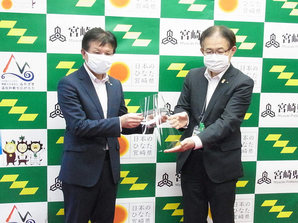 リコージャパン株式会社は、このたび宮崎県立宮崎病院にフェイスシールド130個を無償提供いたしました。それに先立ち5月13日、宮崎県庁においてフェイスシールドの贈呈式が行われました。