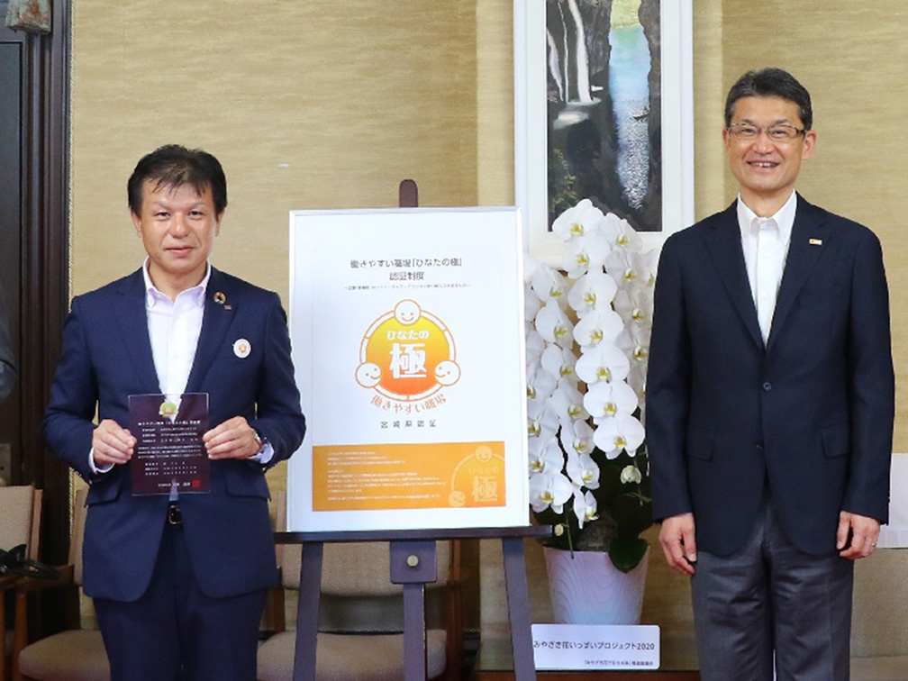 宮崎県では、仕事と生活の調和の実現に向けた職場環境づくりを積極的に行なっている企業や事業所のうち、特に優れた取組成果が認められる企業等を「働きやすい職場『ひなたの極』」として知事が認証しています。