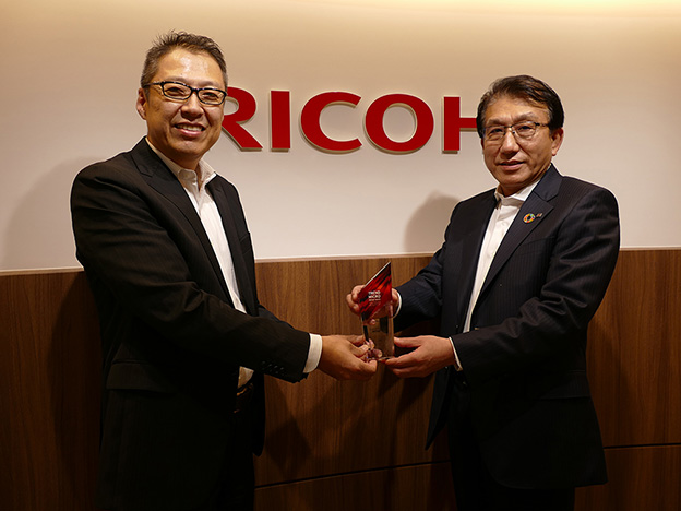 トレンドマイクロ 上席執行役員 営業統括 大場 章弘様(左)から、リコージャパン 常務執行役員 木村 和広にトロフィーを授与