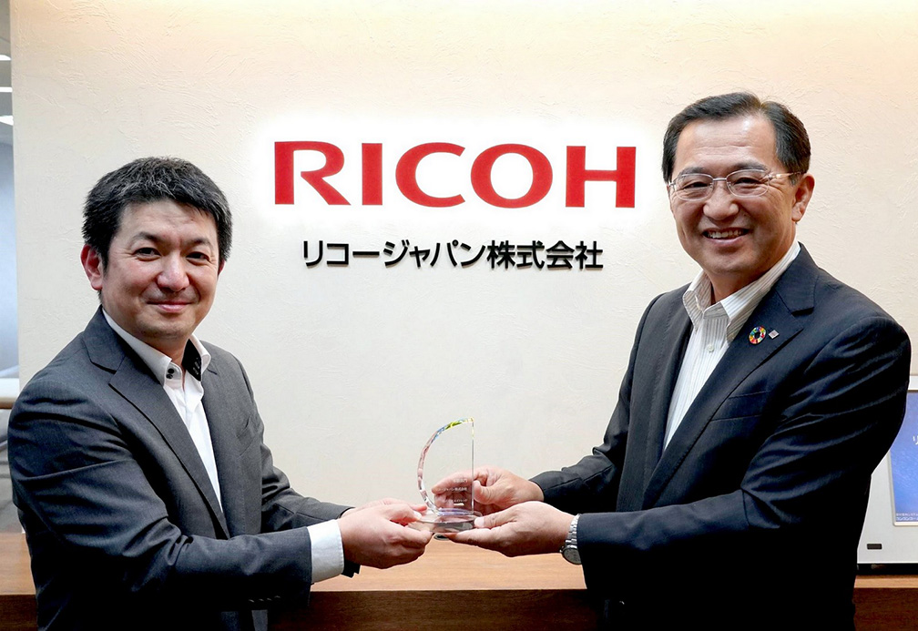 エイトレッド 代表取締役社長 岡本 康広様(左)から、リコージャパン 執行役員 野澤 浩一にトロフィーを授与