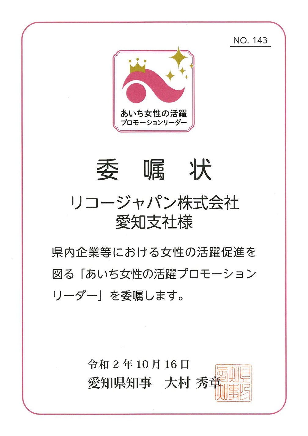 リコージャパン愛知支社は、10月16日「あいち女性の活躍プロモーションリーダー」に委嘱されましたのでお知らせします。