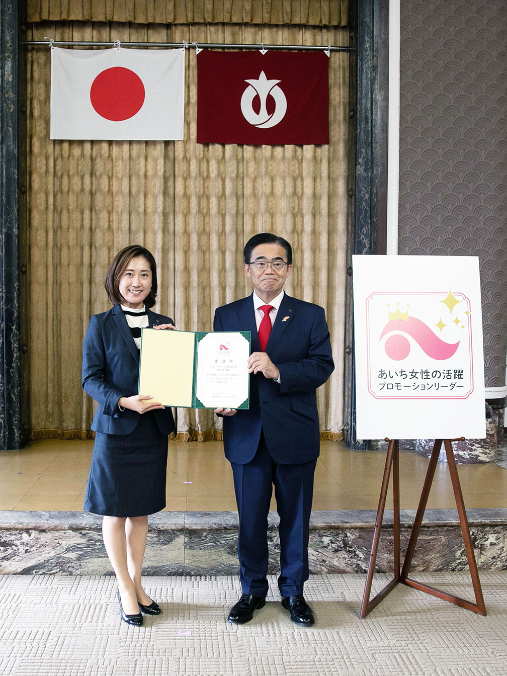 愛知県では、「女性が元気に働き続けられる愛知」の実現に向けて、2013年度から「あいち女性の活躍促進プロジェクト」を推進しています。このプロジェクトの一環として、2018年度から、「あいち女性輝きカンパニー」のうち、取引先企業等に対して、女性の活躍に向けた取組や県施策の活用の働き掛けなどの取組を行っている企業・団体に「あいち女性の活躍プロモーションリーダー」を委嘱しています。