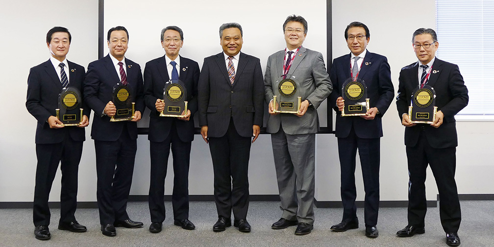 左から、執行役員 宮本 好雄、常務執行役員 青木 鉄雄、専務執行役員 天海 洋一、J.D. パワー 山本 浩二 代表取締役社長、社長執行役員 坂主 智弘、常務執行役員 木村 和広、常務執行役員 松崎 直敏
