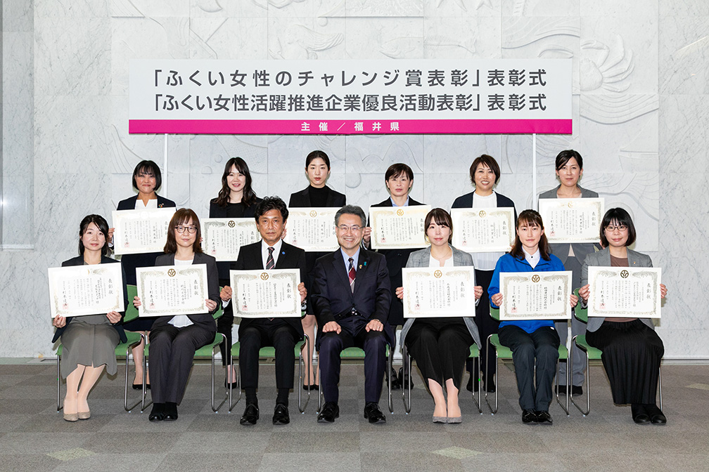 福井県では、女性の活躍推進に向けて積極的に取り組む企業を「ふくい女性活躍推進企業」として登録しており、その登録企業のうち、女性の採用・育成・登用などに積極的に取り組み、県内企業の模範となるような企業ならびに職業上の優れた成果を上げた女性個人やグループを表彰しています。