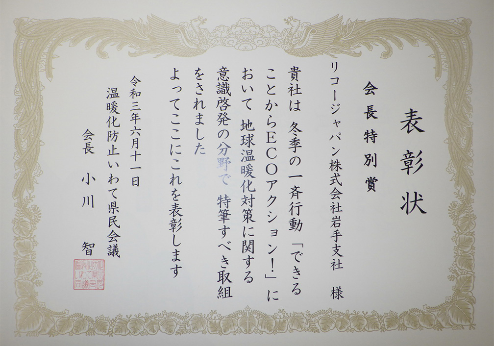 リコージャパン岩手支社は、このたび令和3年度 温暖化防止いわて県民会議「できることからECOアクション!」会長特別賞(意識啓発部門)を受賞したことをお知らせいたします。