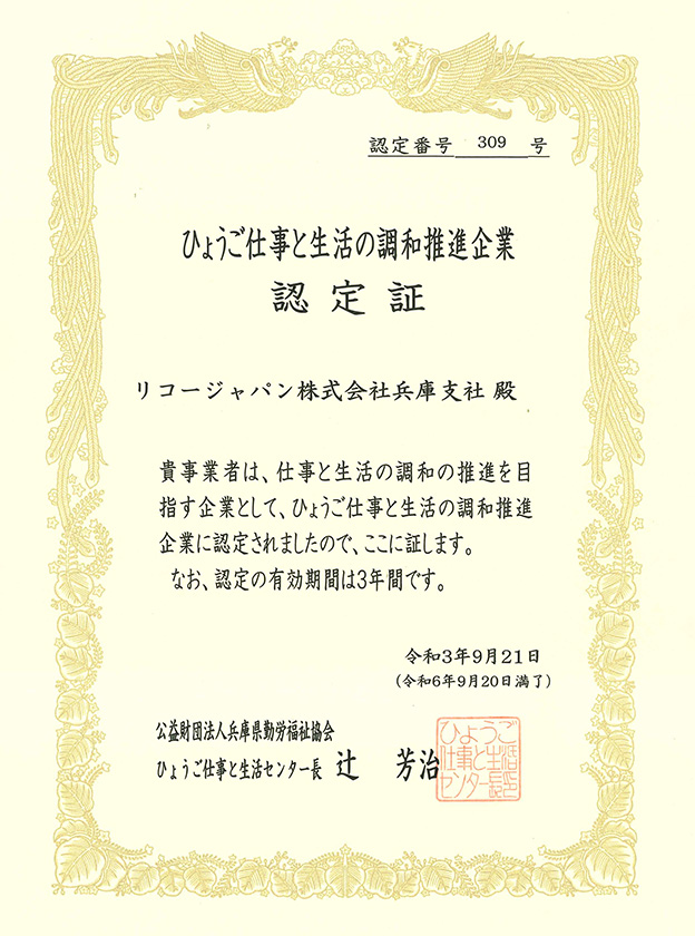 リコージャパン兵庫支社は、このたび「ひょうご仕事と生活の調和 推進企業」に認定されたことをお知らせします。