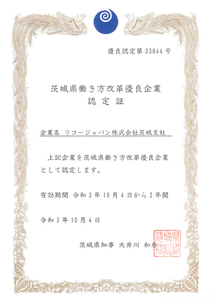 リコージャパン茨城支社は、このたび「令和3年度茨城県働き方改革優良企業」に認定されたことをお知らせします。