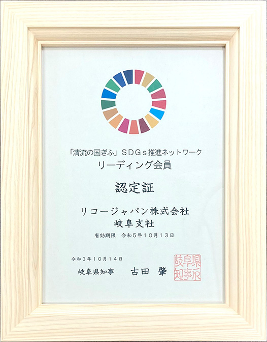 リコージャパン岐阜支社は、このたび令和3年度「『清流の国ぎふ』SDGs推進ネットワーク」リーディング会員に認定されたことをお知らせいたします。