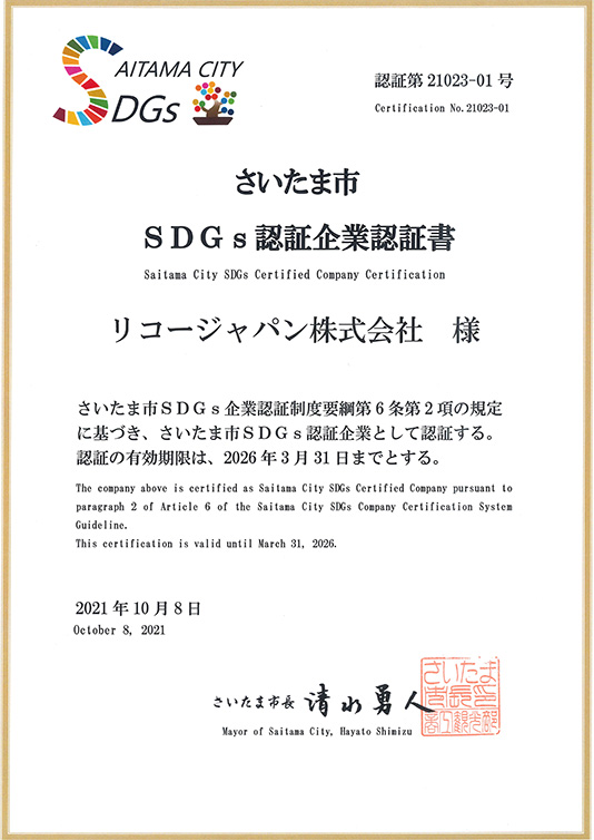 リコージャパン株式会社 埼玉支社は、このたび「令和3年度さいたま市SDGs認証企業」に認証されたことをお知らせします。