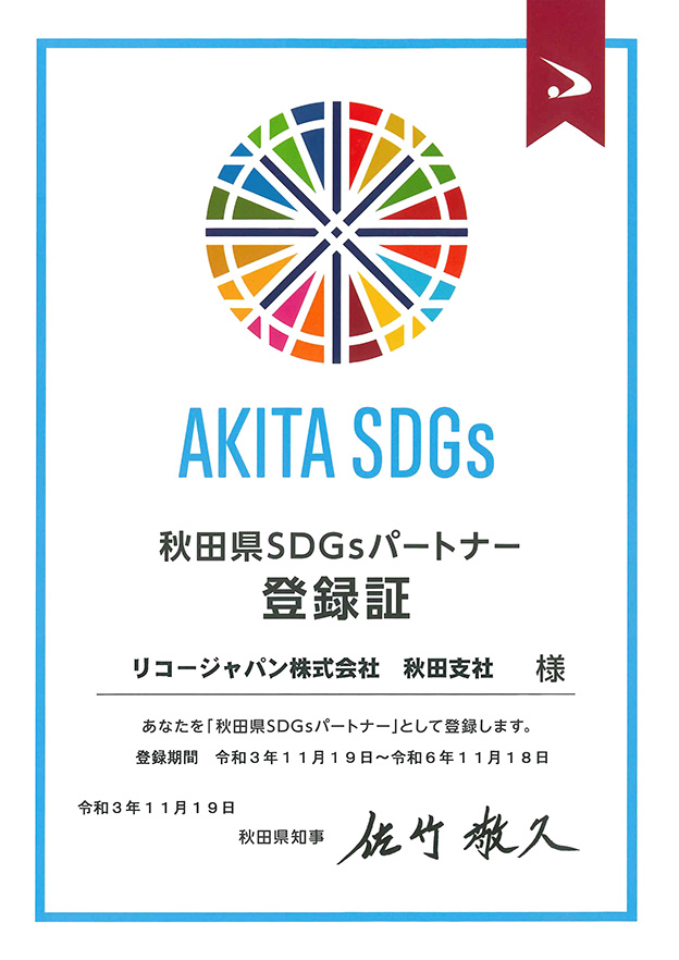 リコージャパン株式会社 秋田支社は、このたび秋田県の「秋田県SDGsパートナー」に登録されたことをお知らせします。